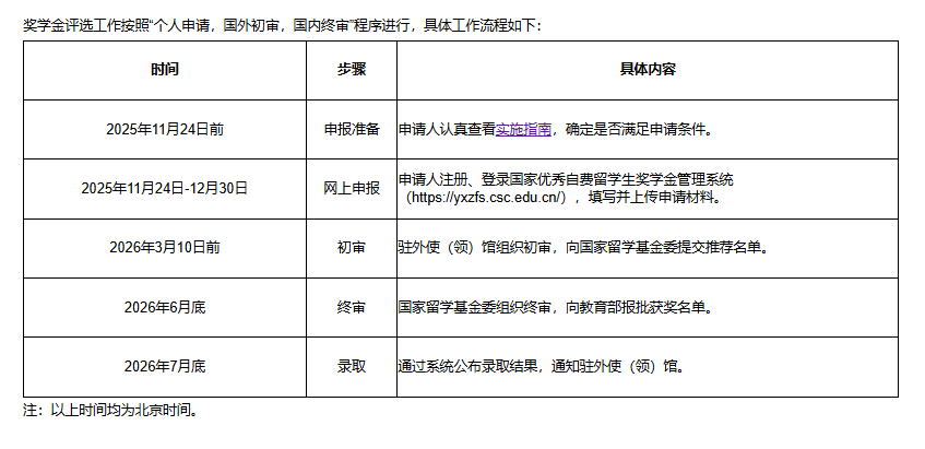 符合条件的申请人须于北京时间2025年11月24日至12月30日期间登陆“国家优秀自费留学生奖学金管理系统”(http://yxzfs.csc.edu.cn),按要求提交申请。请务必注意时差,逾期无法进行网上申请、提交材料、修改信息等操作。申请人需提交材料及要求详见国家留学网(https://www.csc.edu.cn/chuguo/s/3847)。