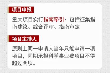另外,《办法》还提到,项目主持人应具有较强组织协调能力和学术影响力,保证有足够的时间和精力从事项目的组织和研究工作。原则上同一申请人当年只能申请一项项目,同期承担科学事业费项目不得超过两项。B、C类项目主持人一般应为科技委委员和学部委员。