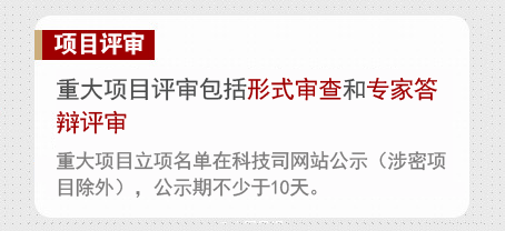 科学事业费重大项目实行全流程管理,包括指南与申报、评审与立项、实施与验收等环节。