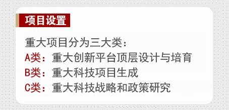 根据《办法》,重大项目分别设重大创新平台顶层设计与培育、重大科技项目生成、重大科技战略和政策研究三类。