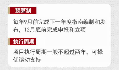 重大项目实行预算制。每年9月前完成下一年度指南编制和发布,12月底前完成申报和立项。项目执行周期一般不超过两年,可择优滚动支持。